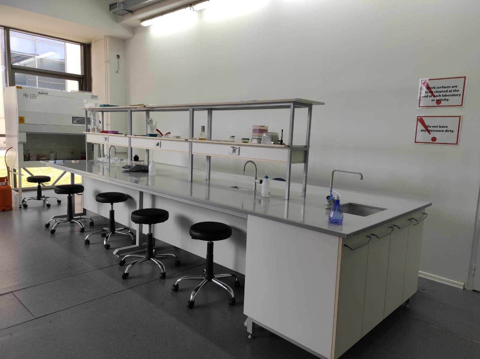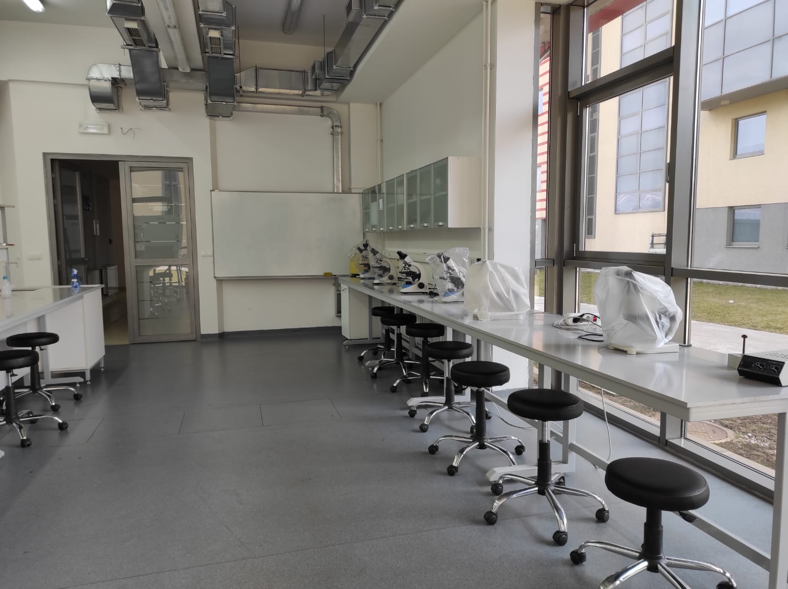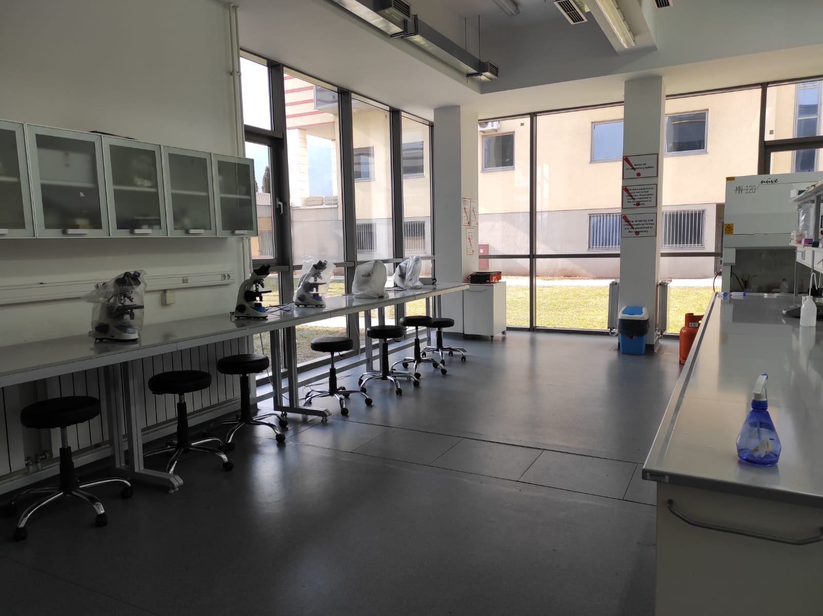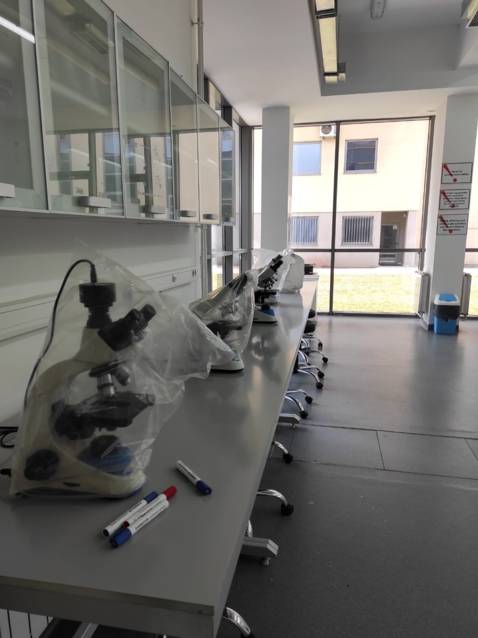 This Lab is also wquipped with microbiological hood. Here students learn basic lab skills such as preparing microbiological media, plating the Petri dishes and inoculating them with bacterial cultures. Furthermore, student learn positive and negative gram staining tezhniques as well as observin bacterial samoles under the microscope.